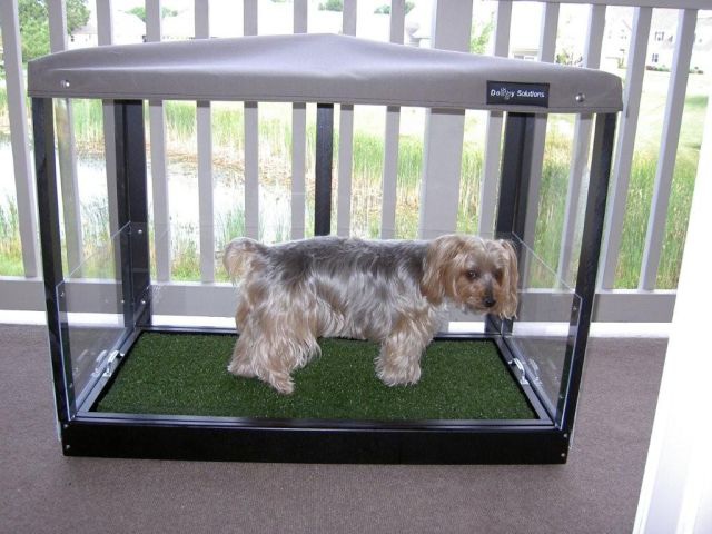 When selecting a box style toilet, like the one shown above from Doggy Solutions, it should be wide enough for your dog to circle comfortably, approximately 1-1/2 times his length. For male dogs, “sidewalls” will prevent overspray from leg lifting. These walls should be higher than your dog’s abdomen.