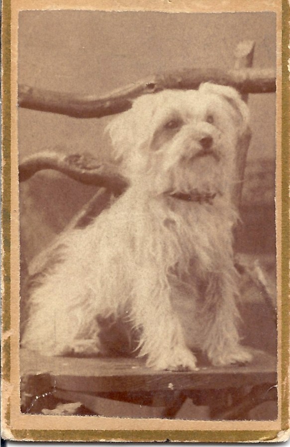 white dog on bench